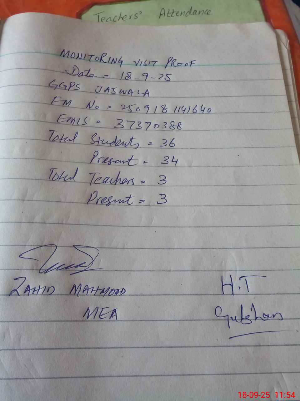 | Attendance Register | Head Teacher | MEA with School | Visit Proof |