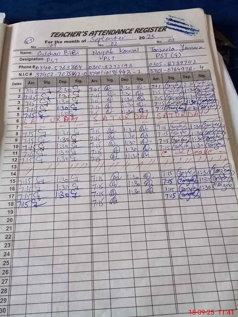 | CNIC | Full Name | Designation | R/C | Absence during last cal. month |