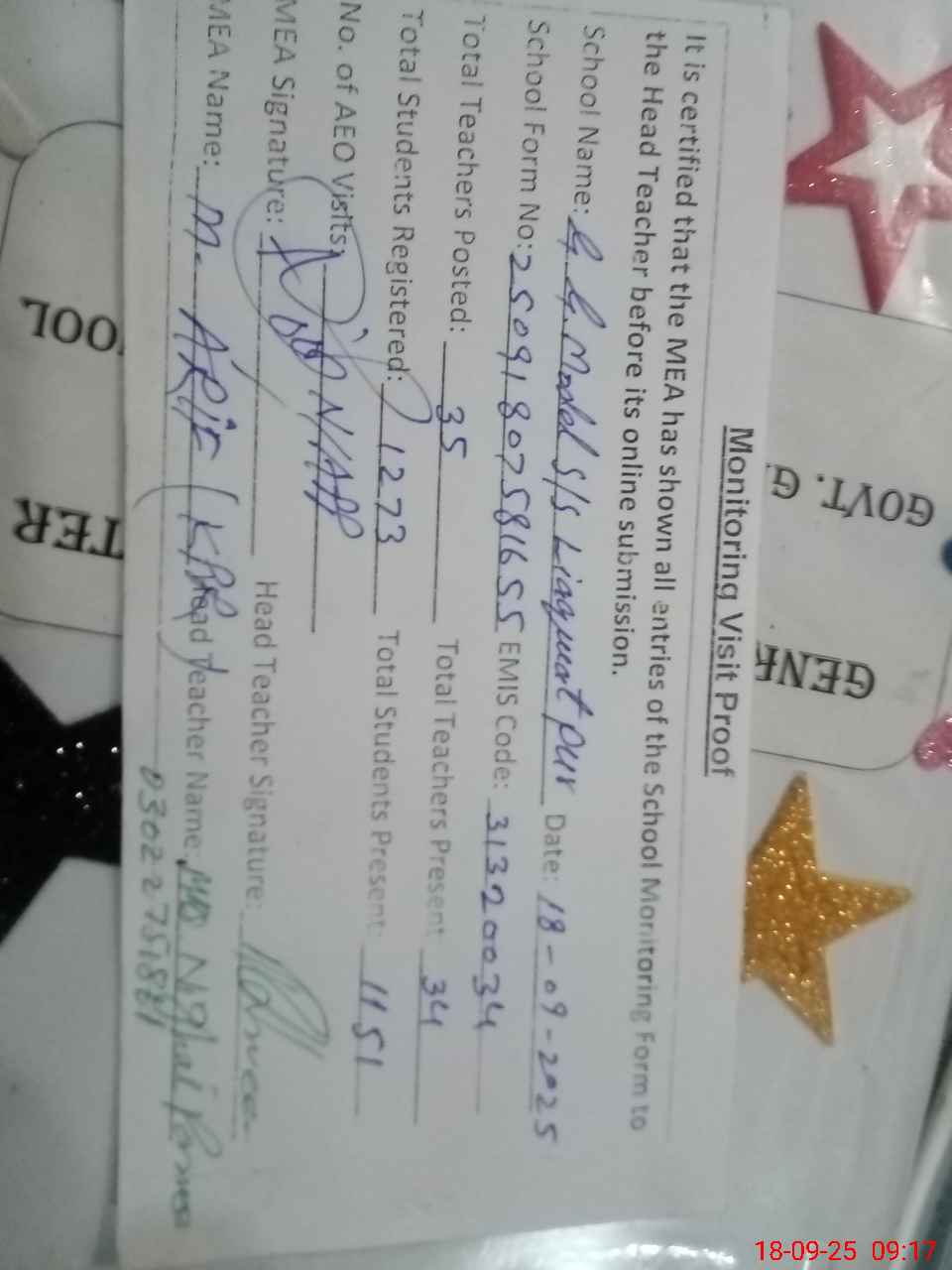 | Attendance Register | Head Teacher | MEA with School | Visit Proof |