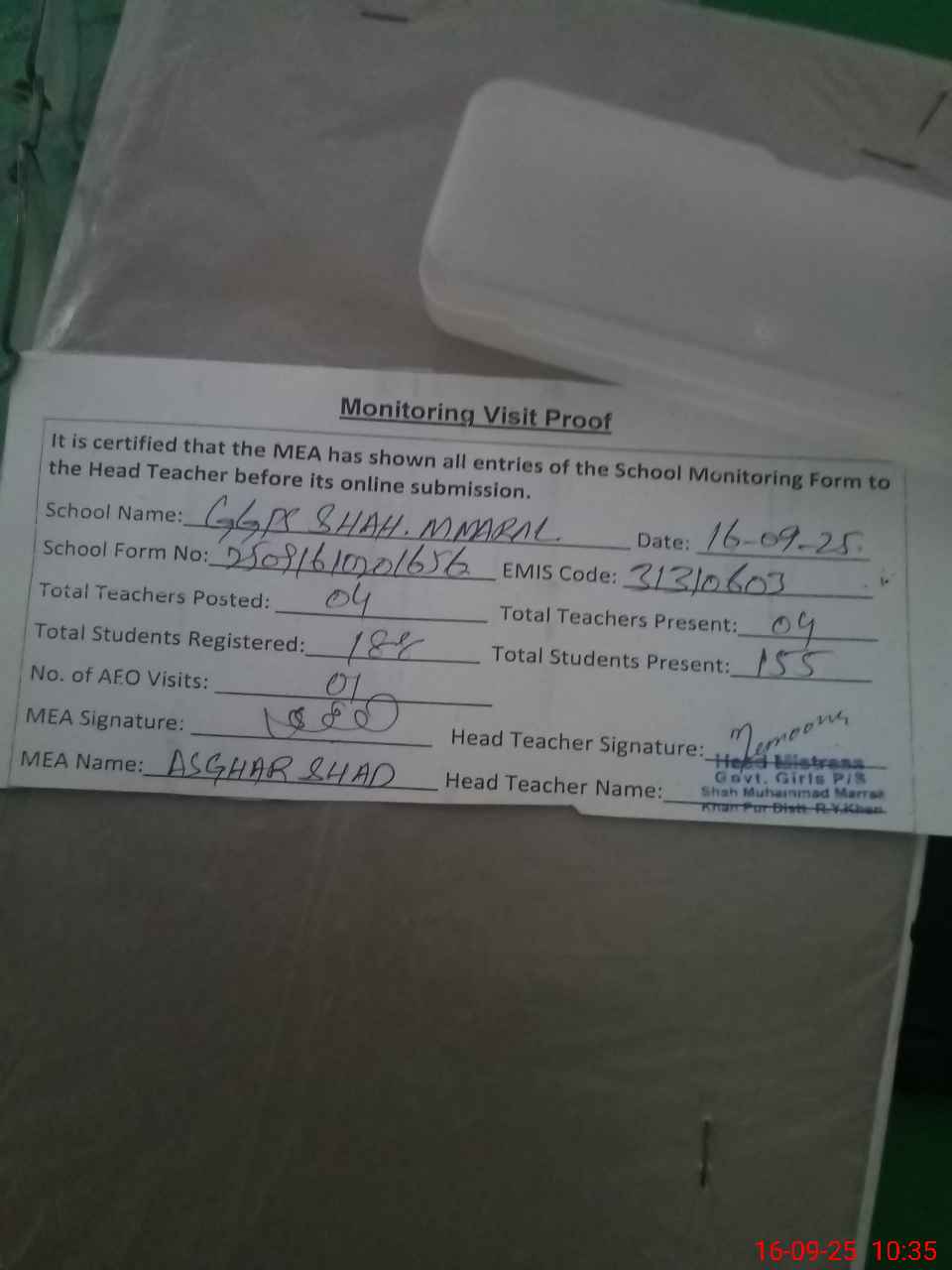 | Attendance Register | Head Teacher | MEA with School | Visit Proof |