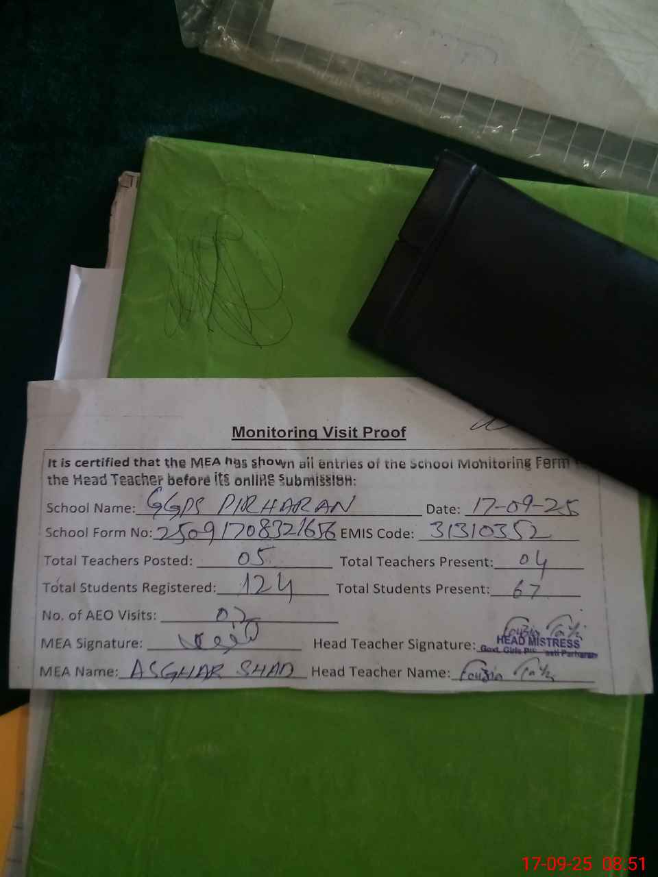 | Attendance Register | Head Teacher | MEA with School | Visit Proof |