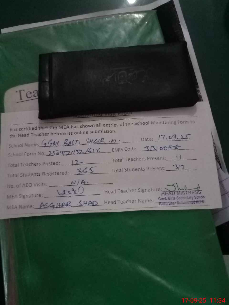 | Attendance Register | Head Teacher | MEA with School | Visit Proof |