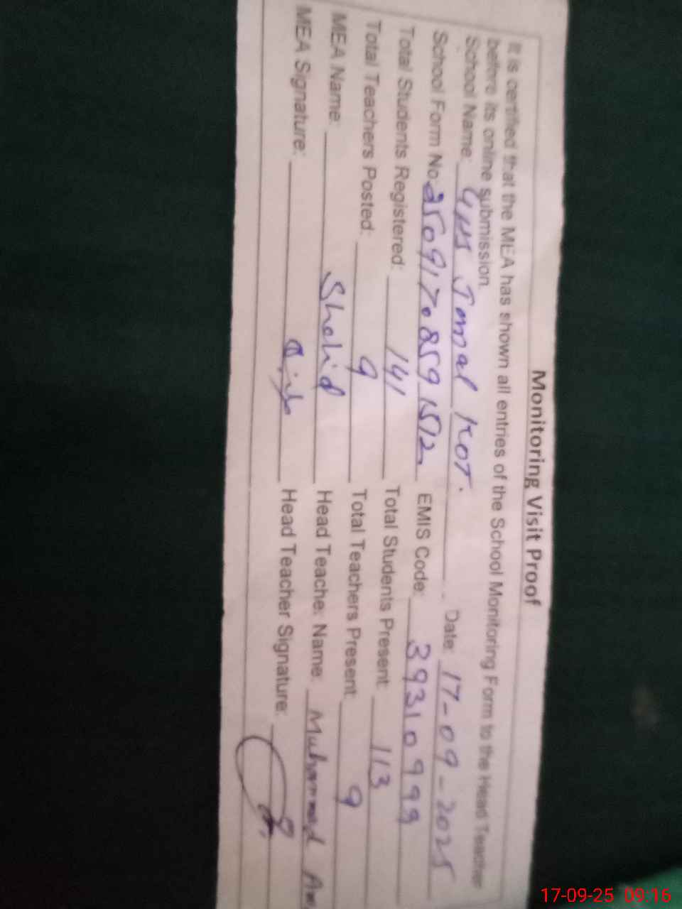| Attendance Register | Head Teacher | MEA with School | Visit Proof |