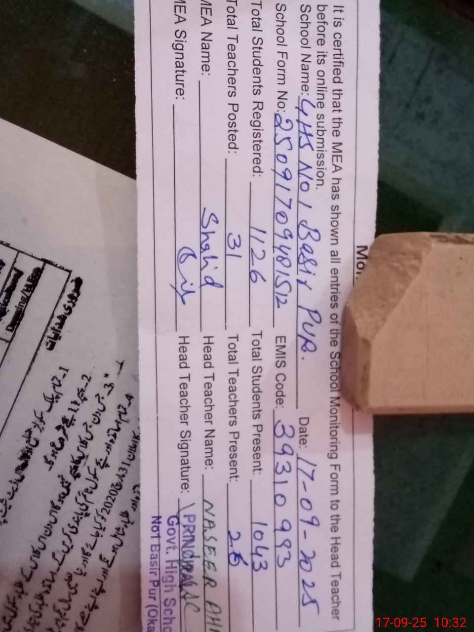 | EMIS Code: 39310993 | Name of School: GHS NO. 1 BASIR PUR MAIN ROAD | |||