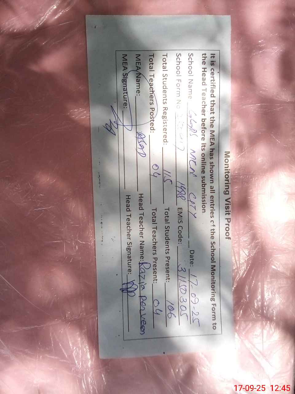| Attendance Register | Head Teacher | MEA with School | Visit Proof |