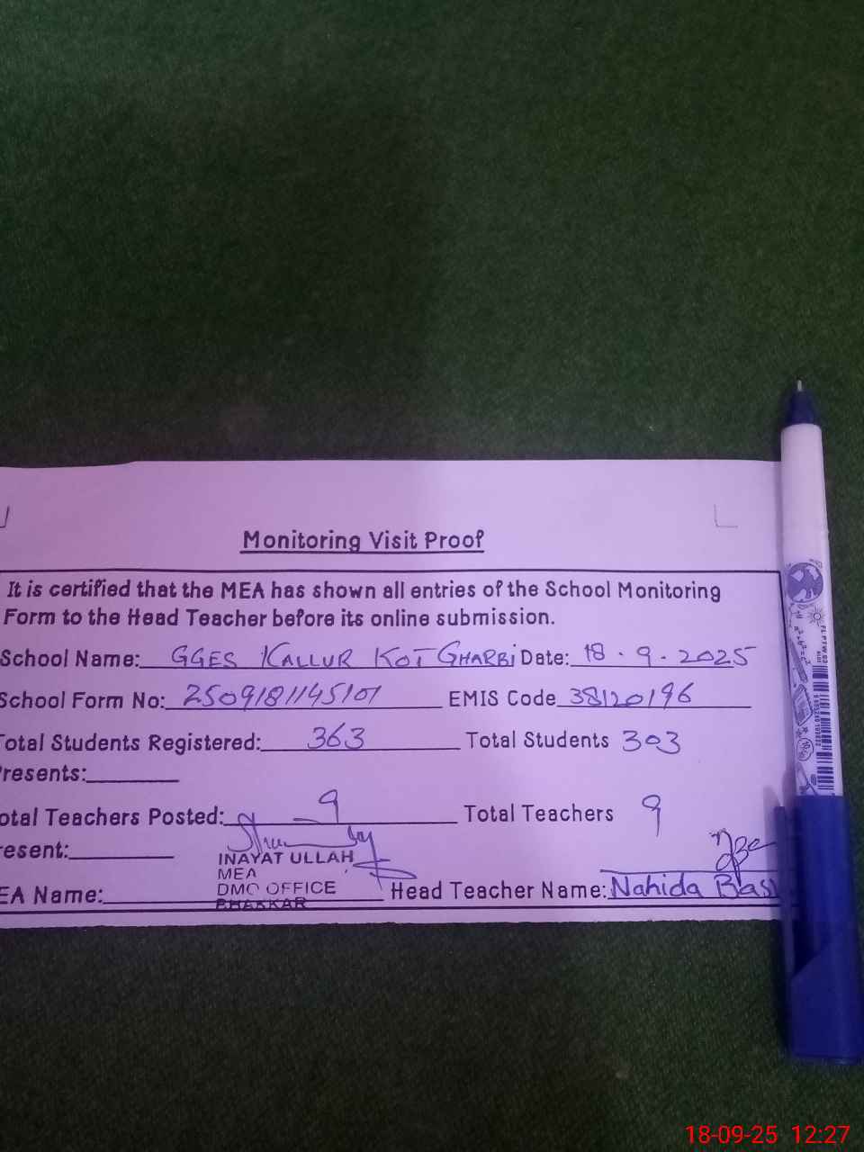 | EMIS Code: 38120196 | Name of School: GGES KALLUR KOT GHARBI | |||