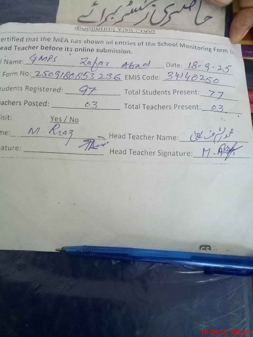 | Attendance Register | Head Teacher | MEA with School | Visit Proof |