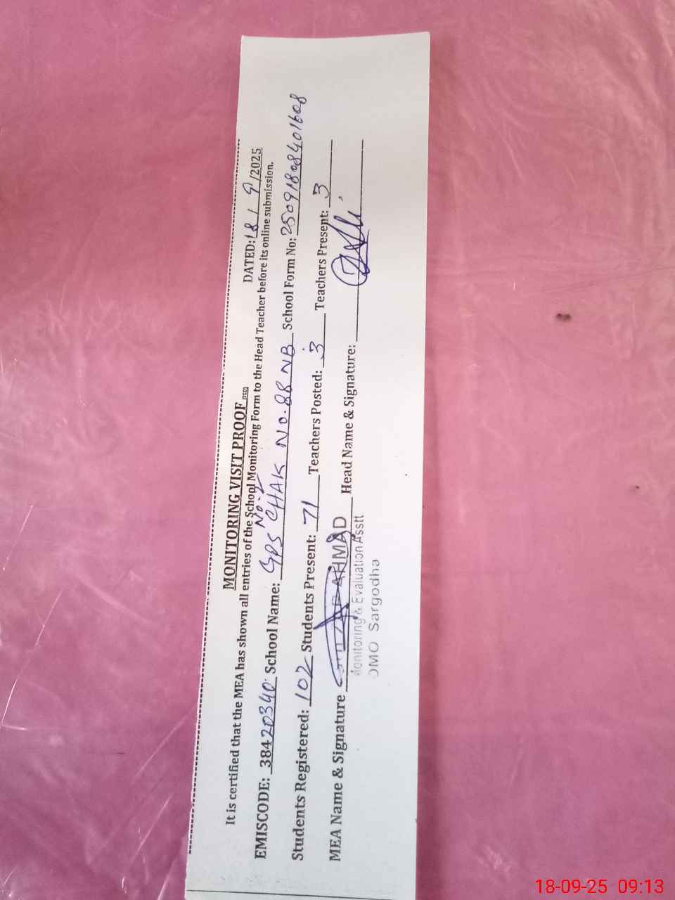 | Attendance Register | Head Teacher | MEA with School | Visit Proof |