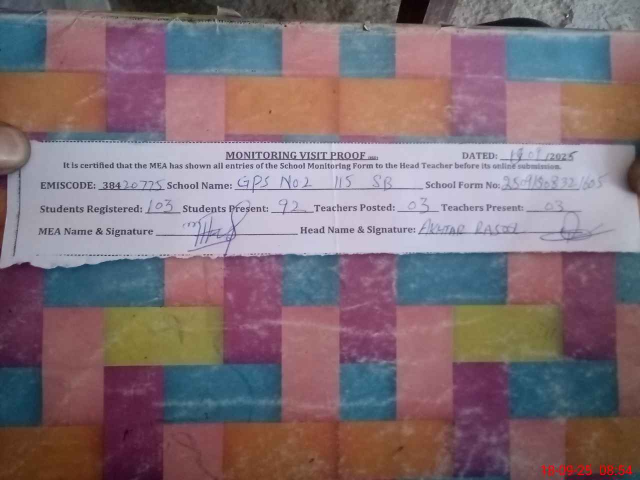| EMIS Code: 38420775 | Name of School: GPS NO 2 CHAK NO 115 SB | |||
