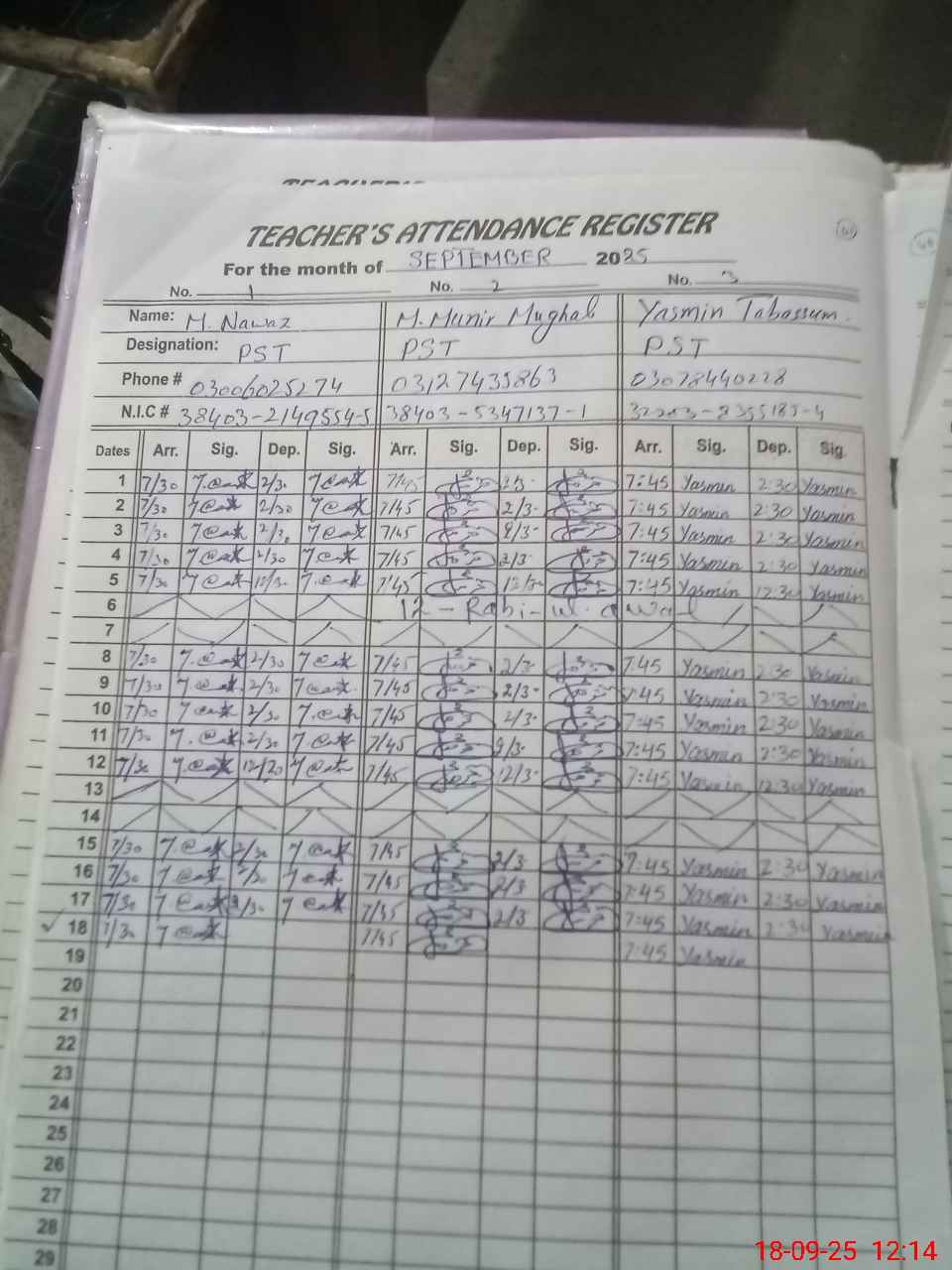 | CNIC | Full Name | Designation | R/C | Absence during last cal. month |