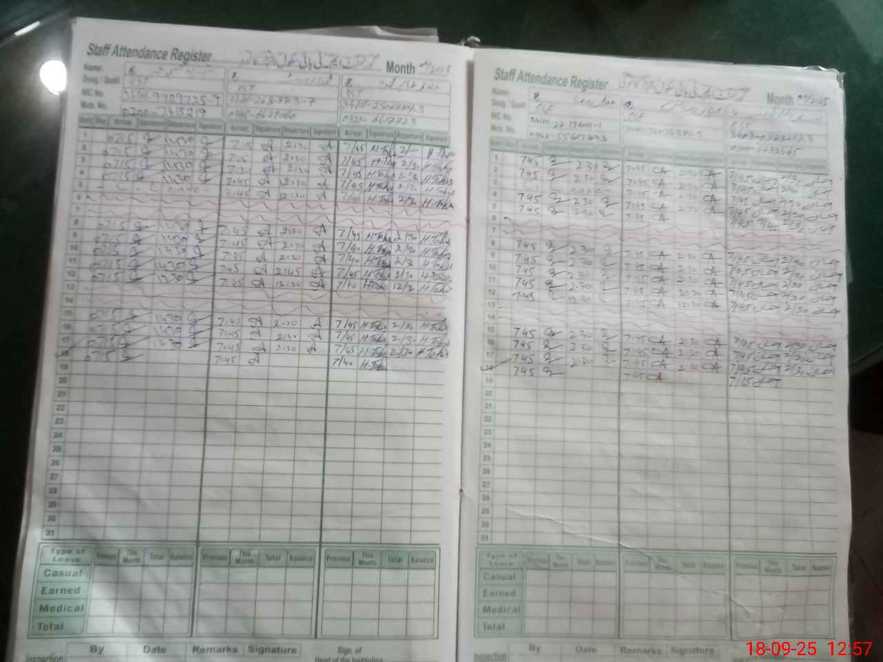| CNIC | Full Name | Designation | R/C | Absence during last cal. month |