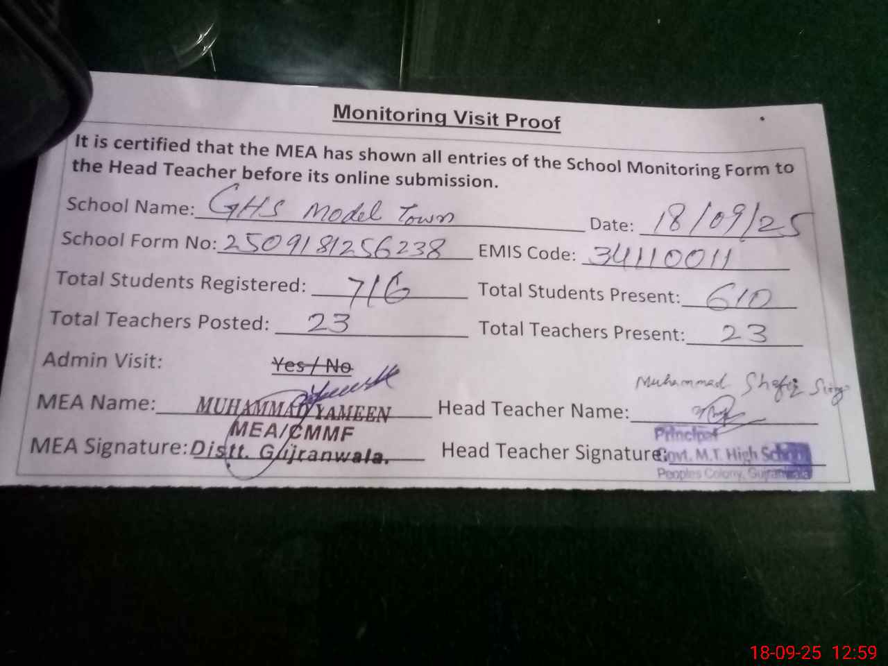 | Attendance Register | Head Teacher | MEA with School | Visit Proof |