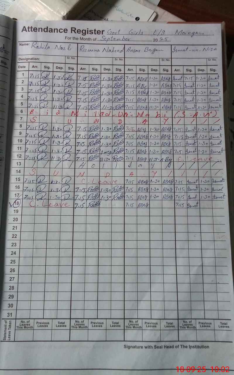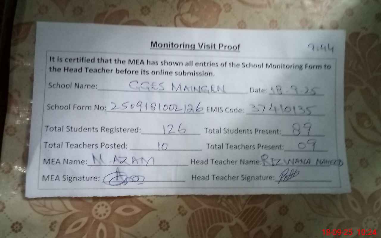 | Attendance Register | Head Teacher | MEA with School | Visit Proof |