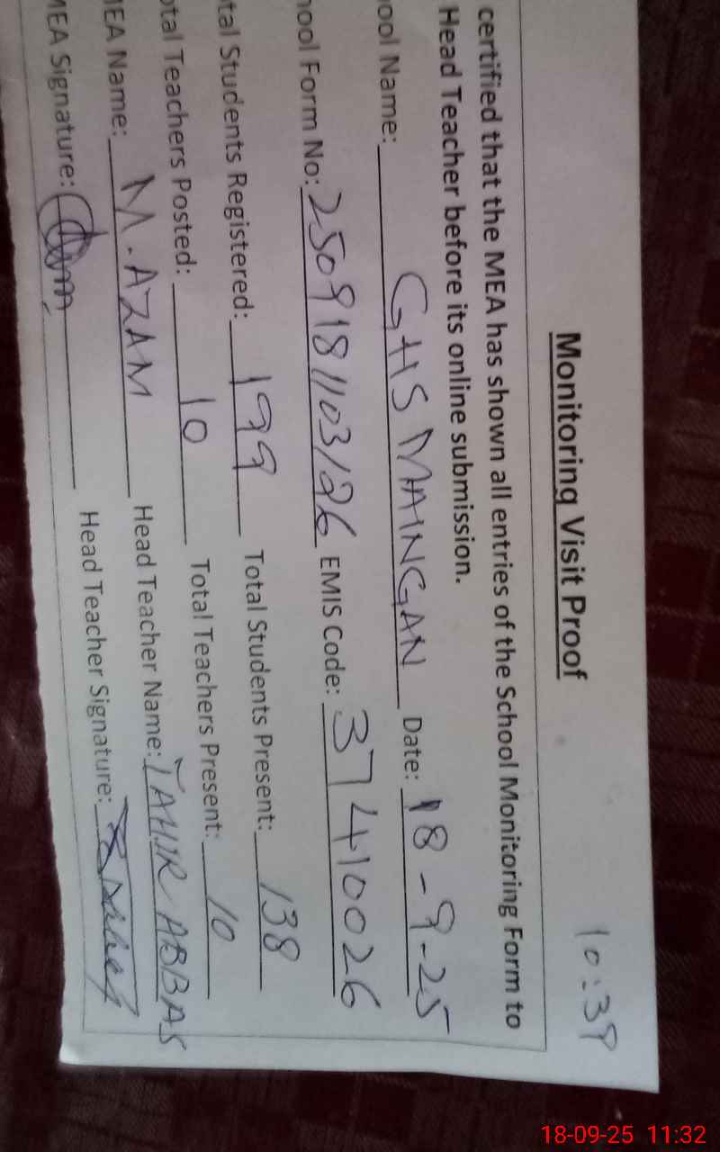 | EMIS Code: 37410026 | Name of School: GHS MAINGAN CHAKWAL | |||