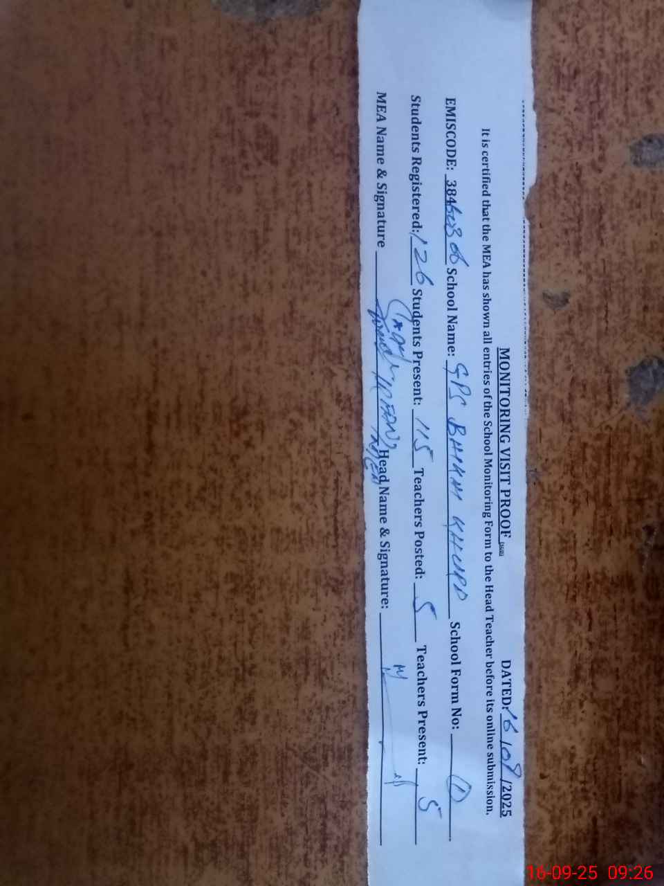 | Attendance Register | Head Teacher | MEA with School | Visit Proof |
