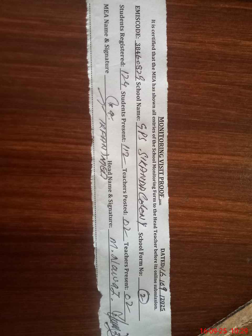 | Attendance Register | Head Teacher | MEA with School | Visit Proof |