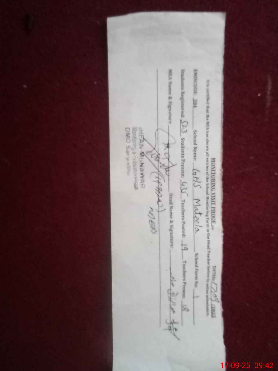 | Certified that this School was Inspected by the Undersigned MEA/DMO Today and the Information Stated Above is as Per Record. | |||||