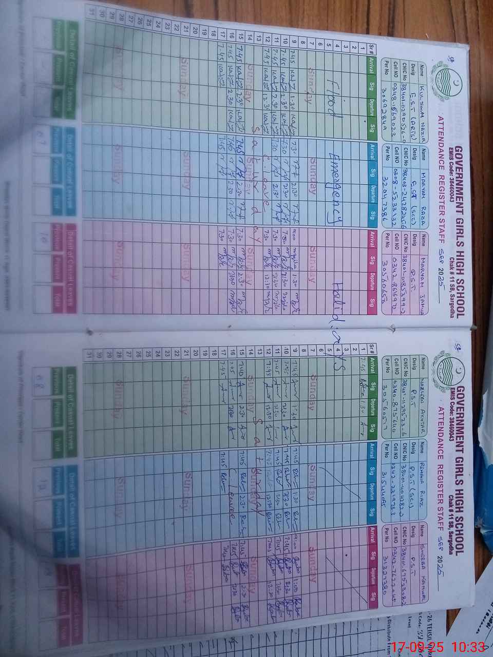 | CNIC | Full Name | Designation | R/C | Absence during last cal. month |