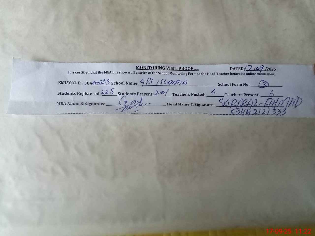 | Attendance Register | Head Teacher | MEA with School | Visit Proof |