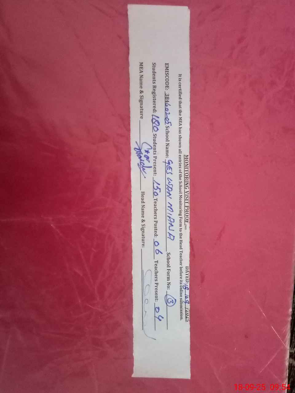 | Attendance Register | Head Teacher | MEA with School | Visit Proof |