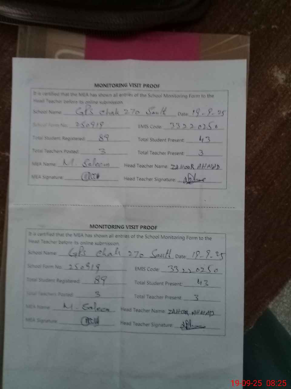 | Attendance Register | Head Teacher | MEA with School | Visit Proof |