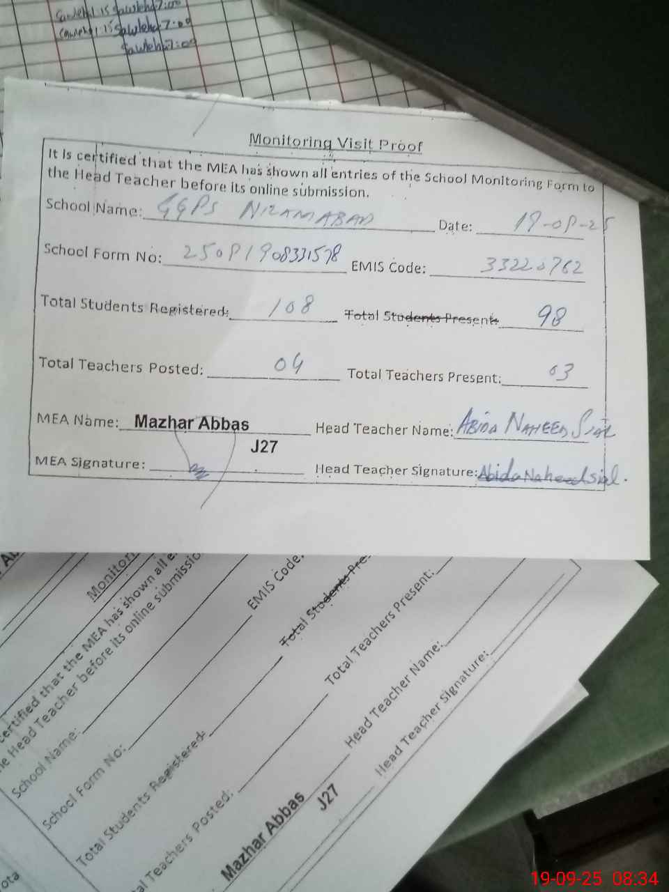 | EMIS Code: 33220762 | Name of School: GGPS NIZAM ABAD | |||