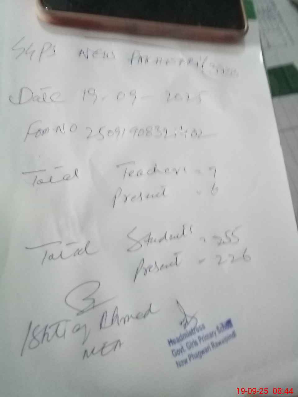 | Name: SH**** SH**** Designation: (School Headmaster's/Headmistress's) PST Phone/Cell Number: 03**** |