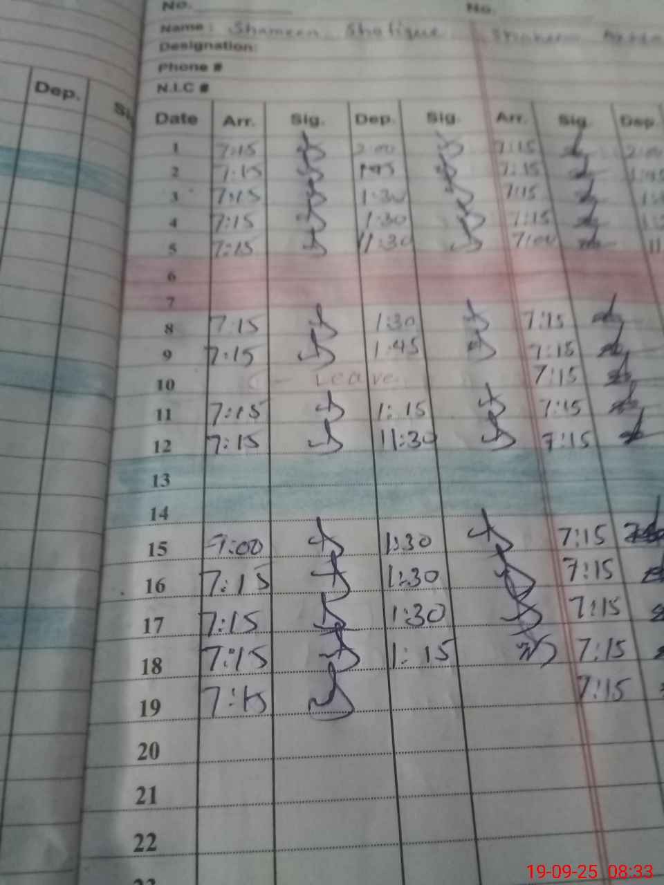 | CNIC | Full Name | Designation | R/C | Absence During Last Calender Month |