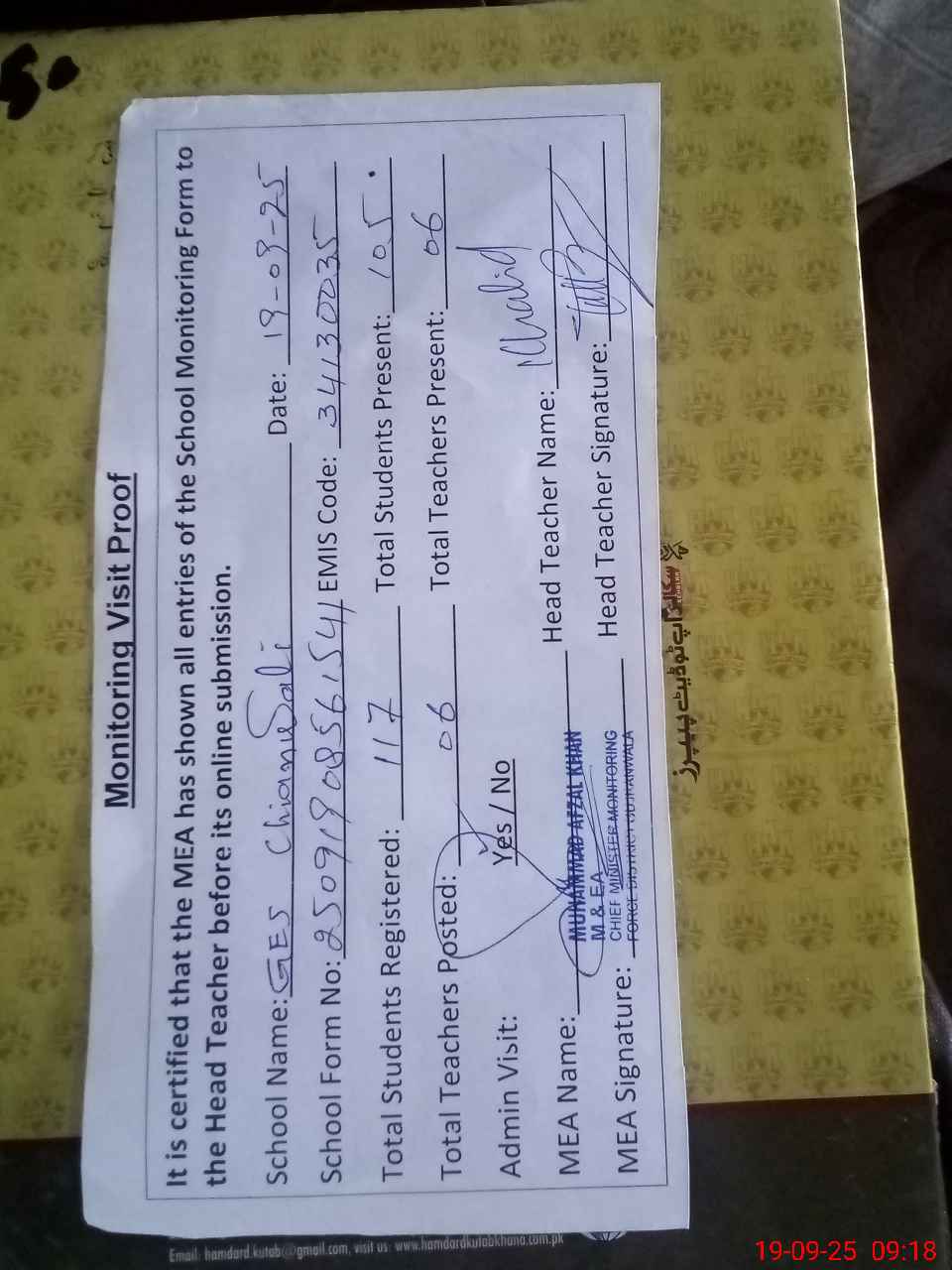 | Attendance Register | Head Teacher | MEA with School | Visit Proof |