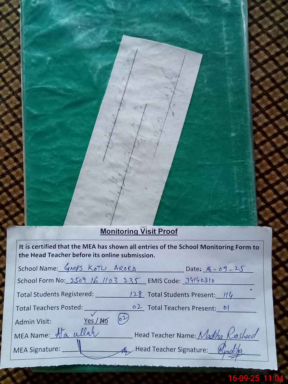 | Attendance Register | Head Teacher | MEA with School | Visit Proof |