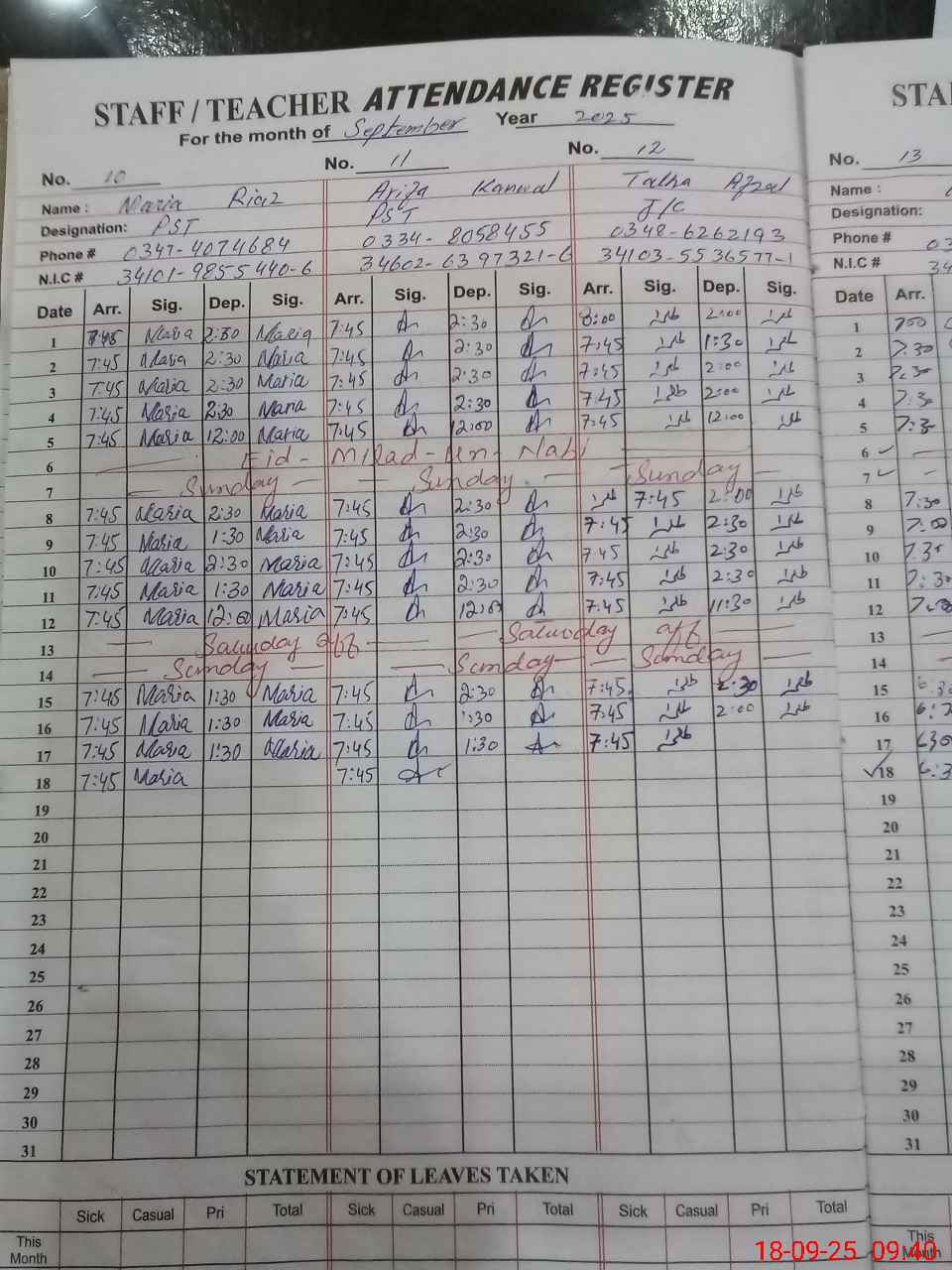 | CNIC | Full Name | Designation | R/C | Absence During Last Calender Month |