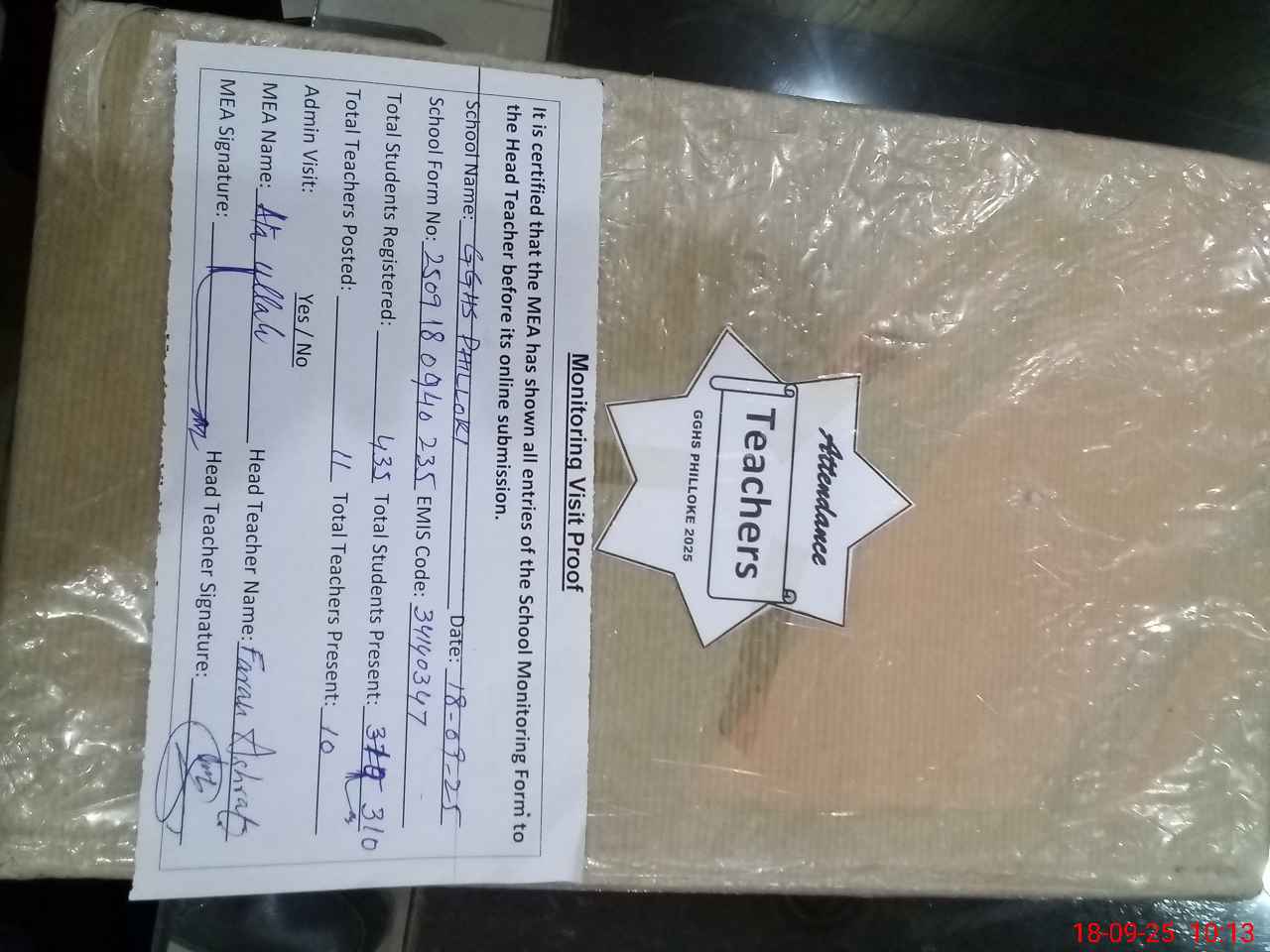 | Attendance Register | Head Teacher | MEA with School | Visit Proof |