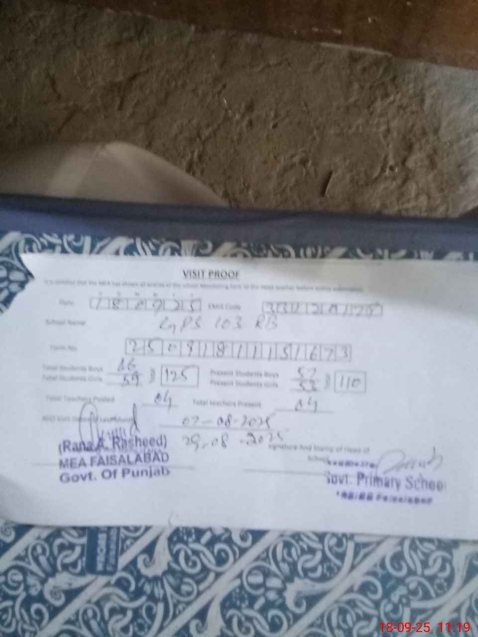 | Attendance Register | Head Teacher | MEA with School | Visit Proof |
