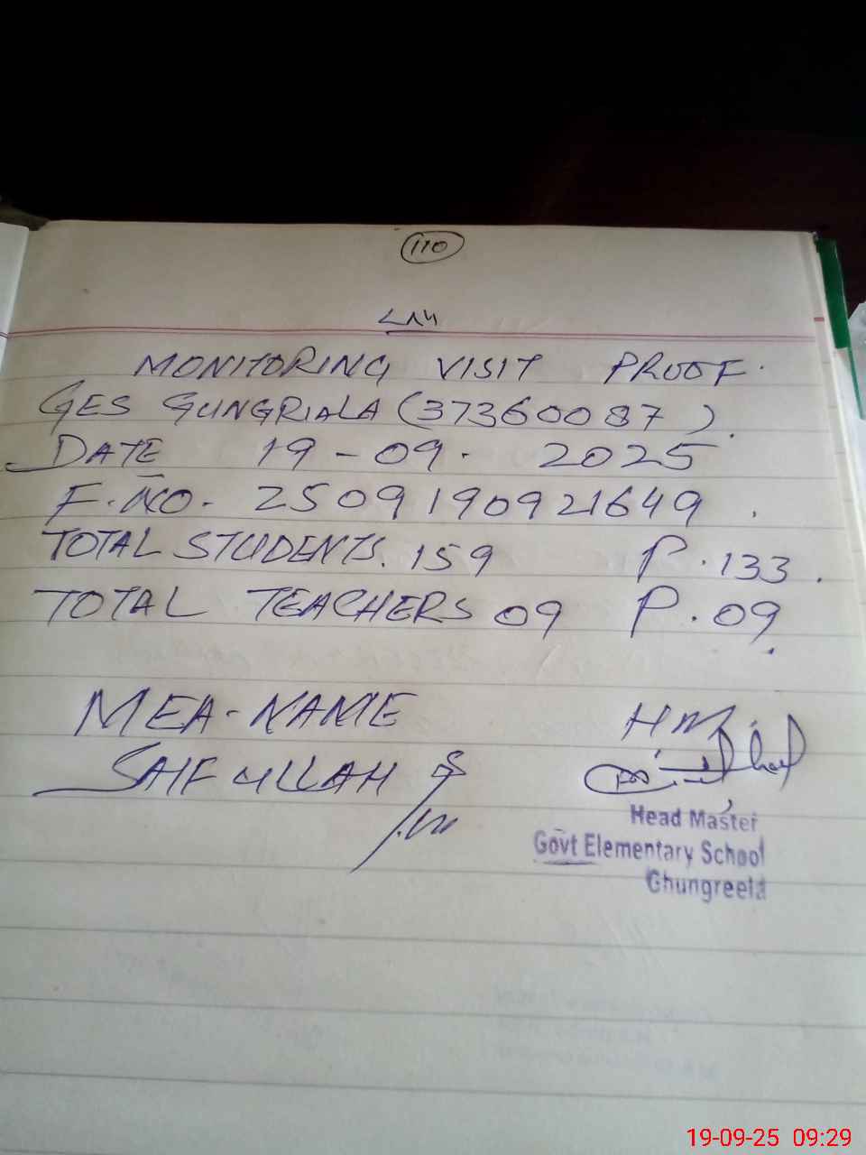 | Attendance Register | Head Teacher | MEA with School | Visit Proof |