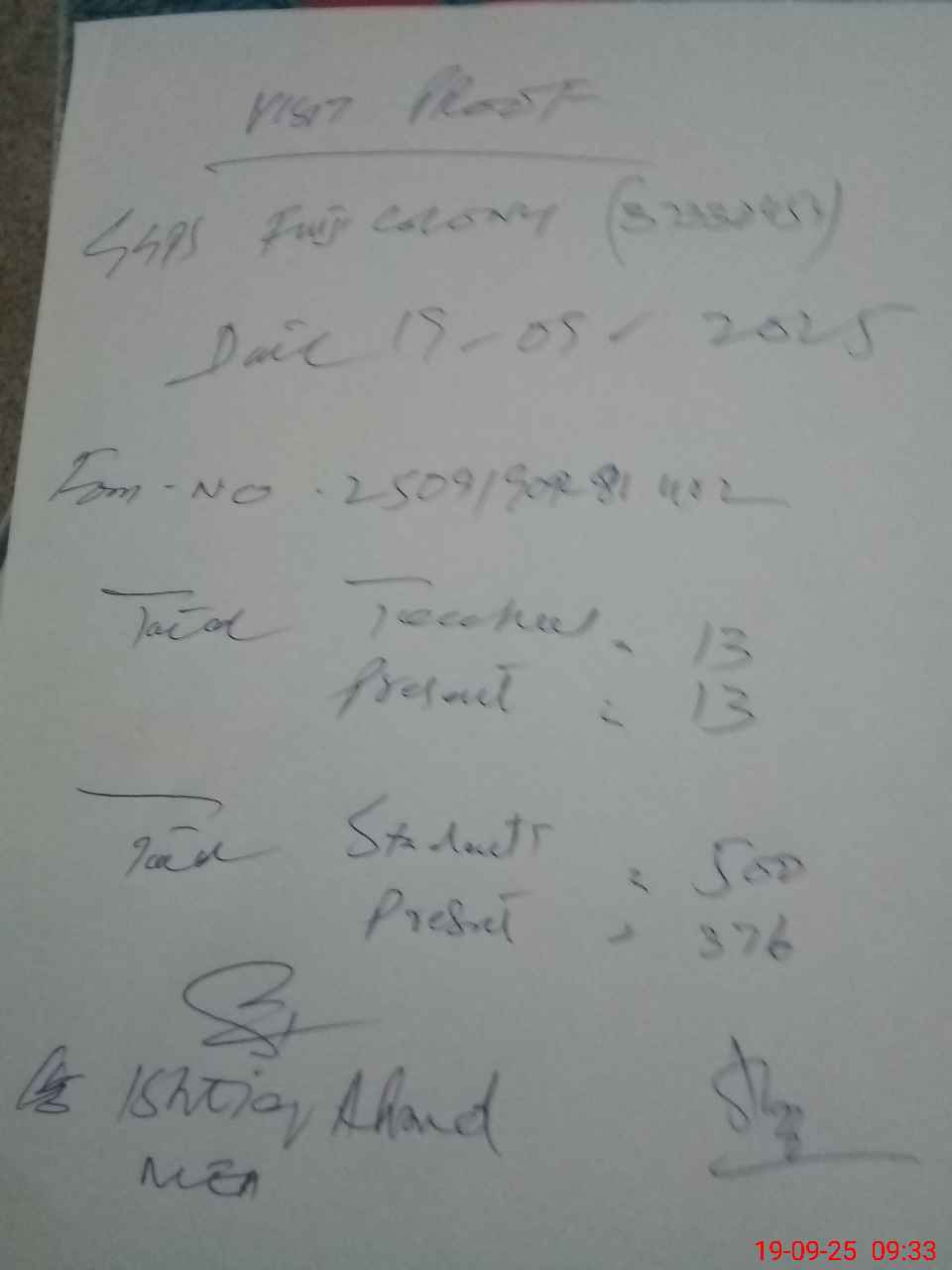 | Attendance Register | Head Teacher | MEA with School | Visit Proof |