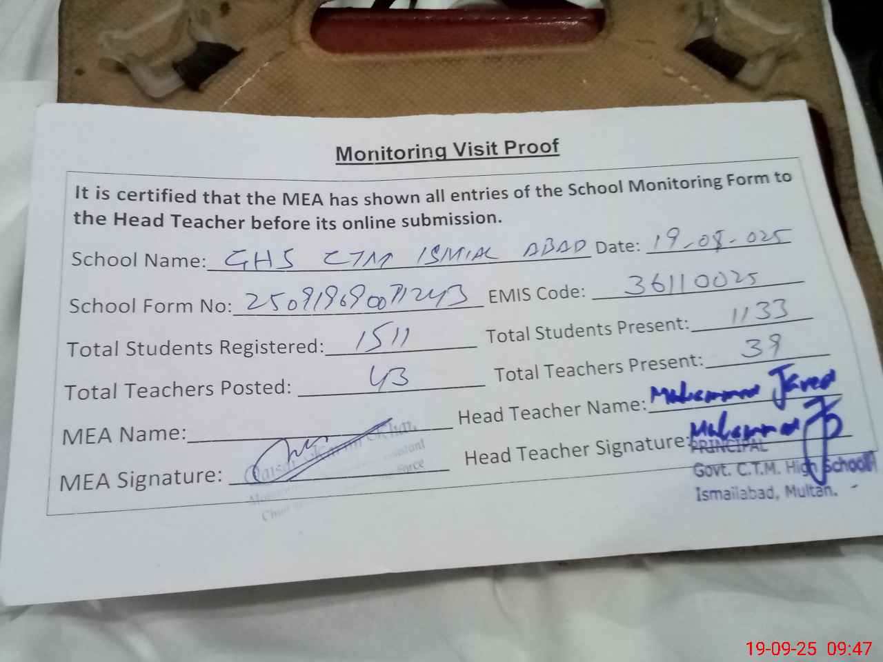 | Attendance Register | Head Teacher | MEA with School | Visit Proof |
