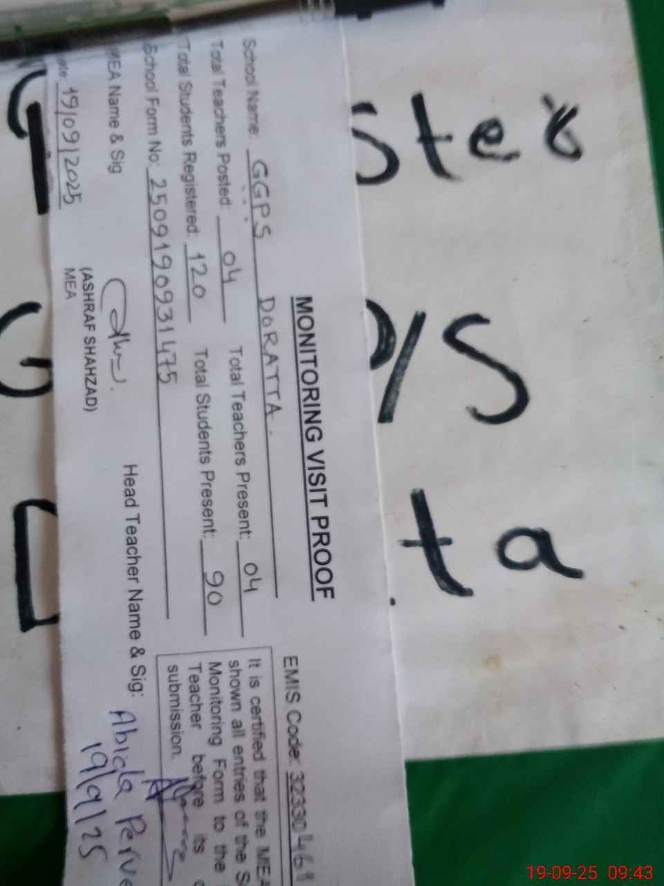 | Attendance Register | Head Teacher | MEA with School | Visit Proof |