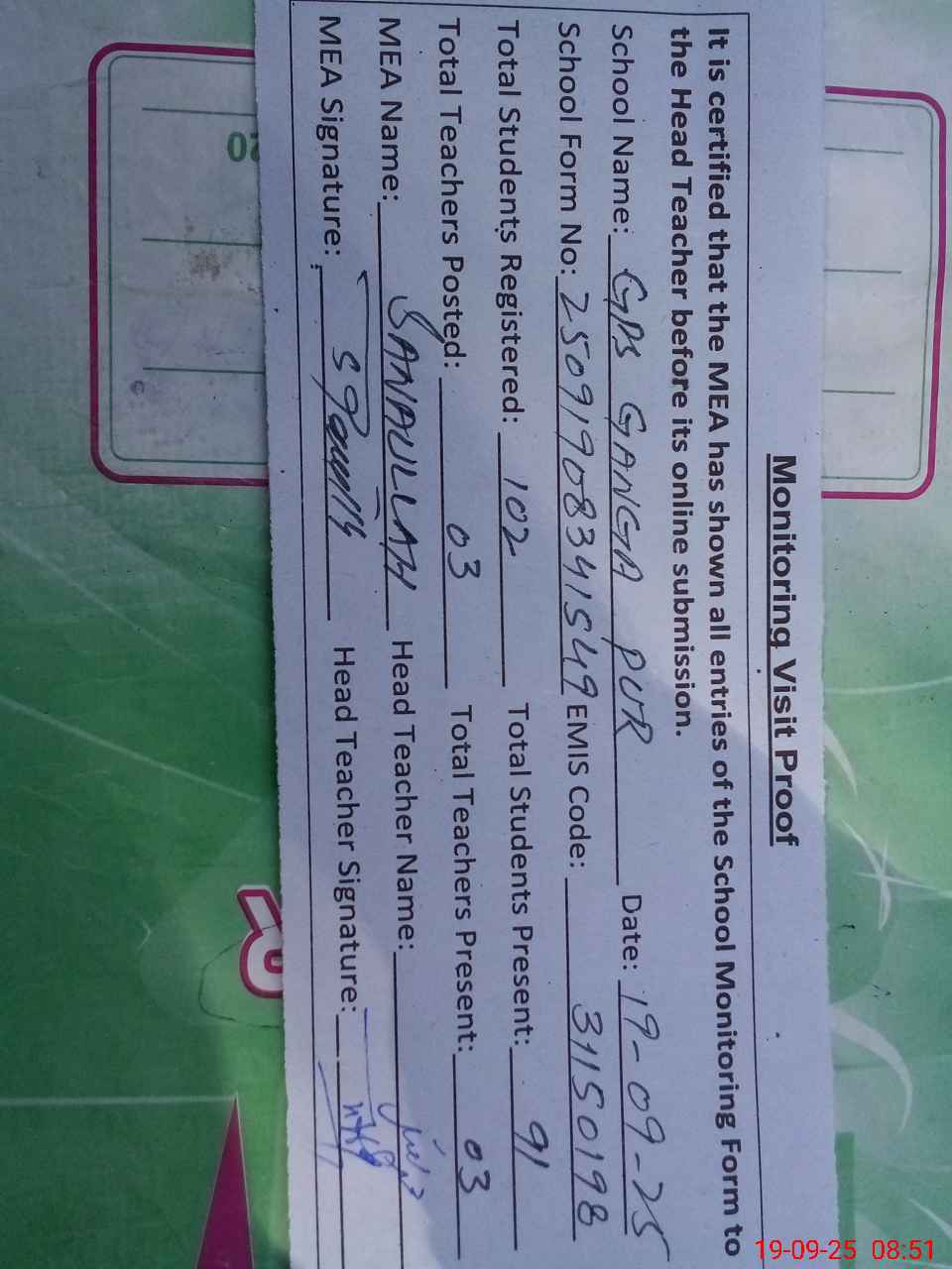 | Attendance Register | Head Teacher | MEA with School | Visit Proof |