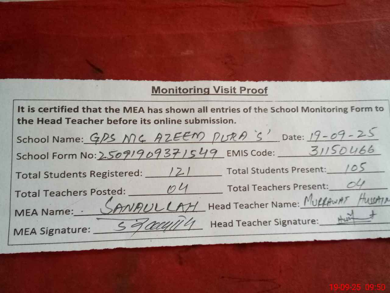 | Attendance Register | Head Teacher | MEA with School | Visit Proof |