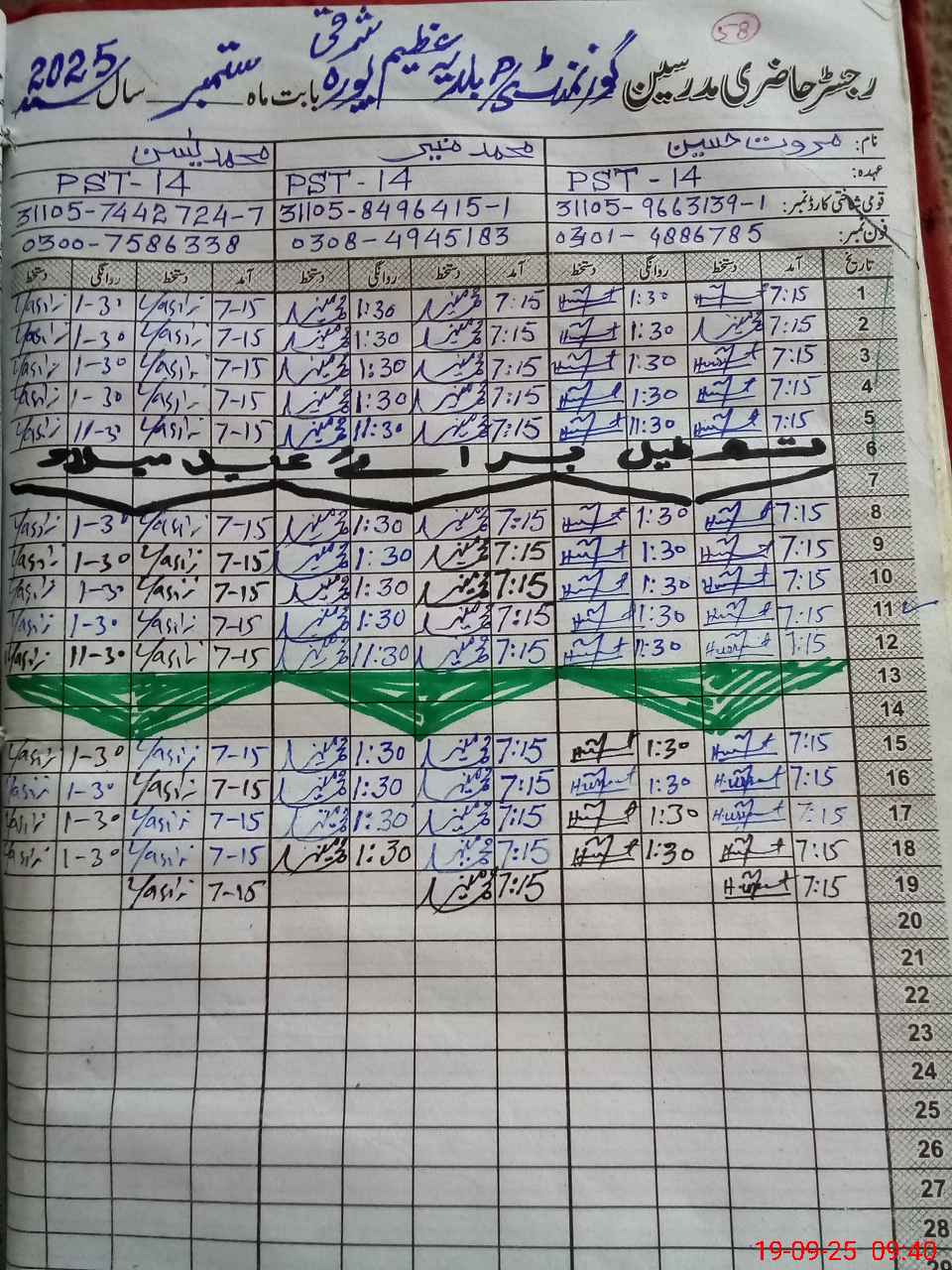 | CNIC | Full Name | Designation | R/C | Absence during last cal. month |