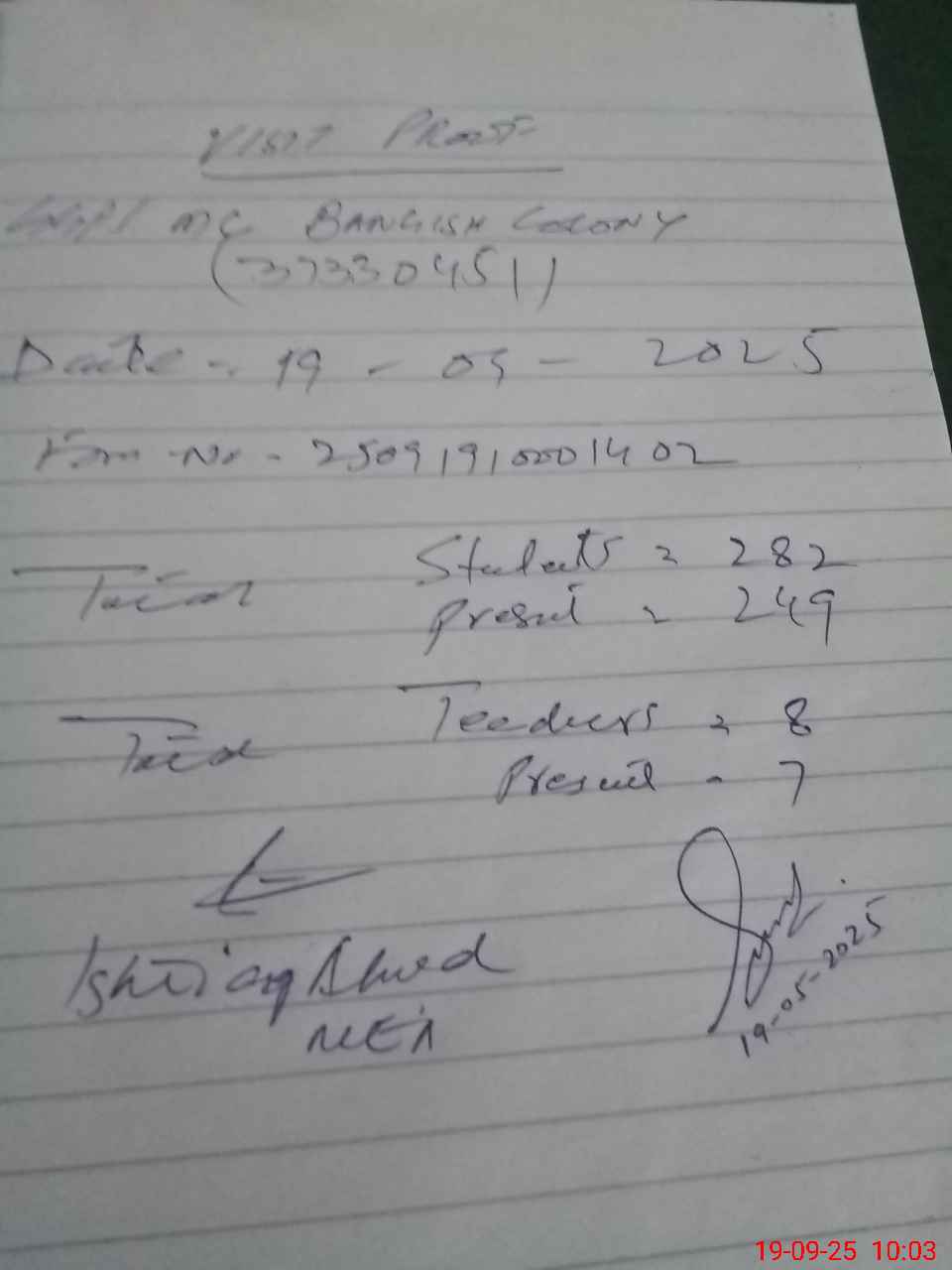 | Attendance Register | Head Teacher | MEA with School | Visit Proof |