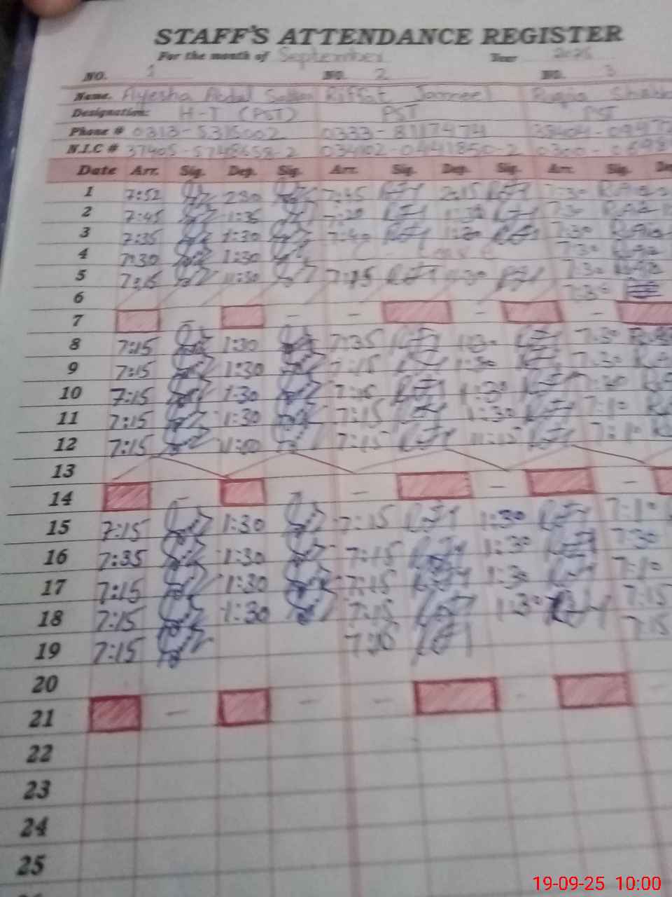 | CNIC | Full Name | Designation | R/C | Absence during last cal. month |