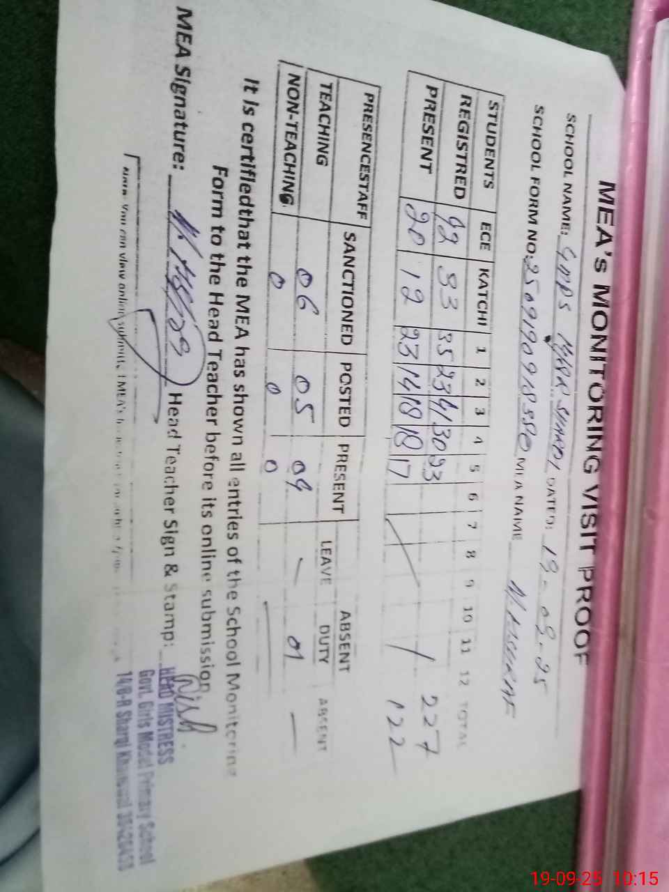 | Attendance Register | Head Teacher | MEA with School | Visit Proof |