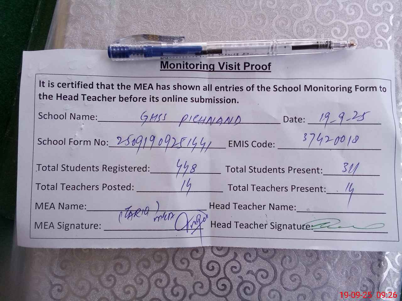 | Attendance Register | Head Teacher | MEA with School | Visit Proof |