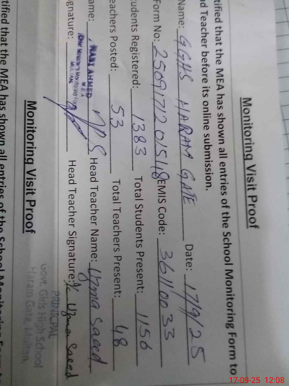 | EMIS Code: 36110033 | Name of School: GGHS HARAM GATE MULTAN | |||