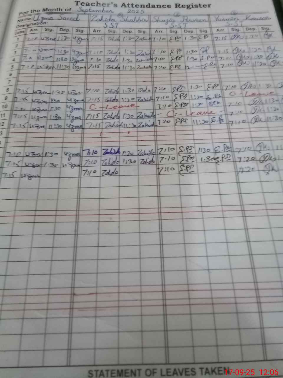 | CNIC | Full Name | Designation | R/C | Absence During Last Calender Month |