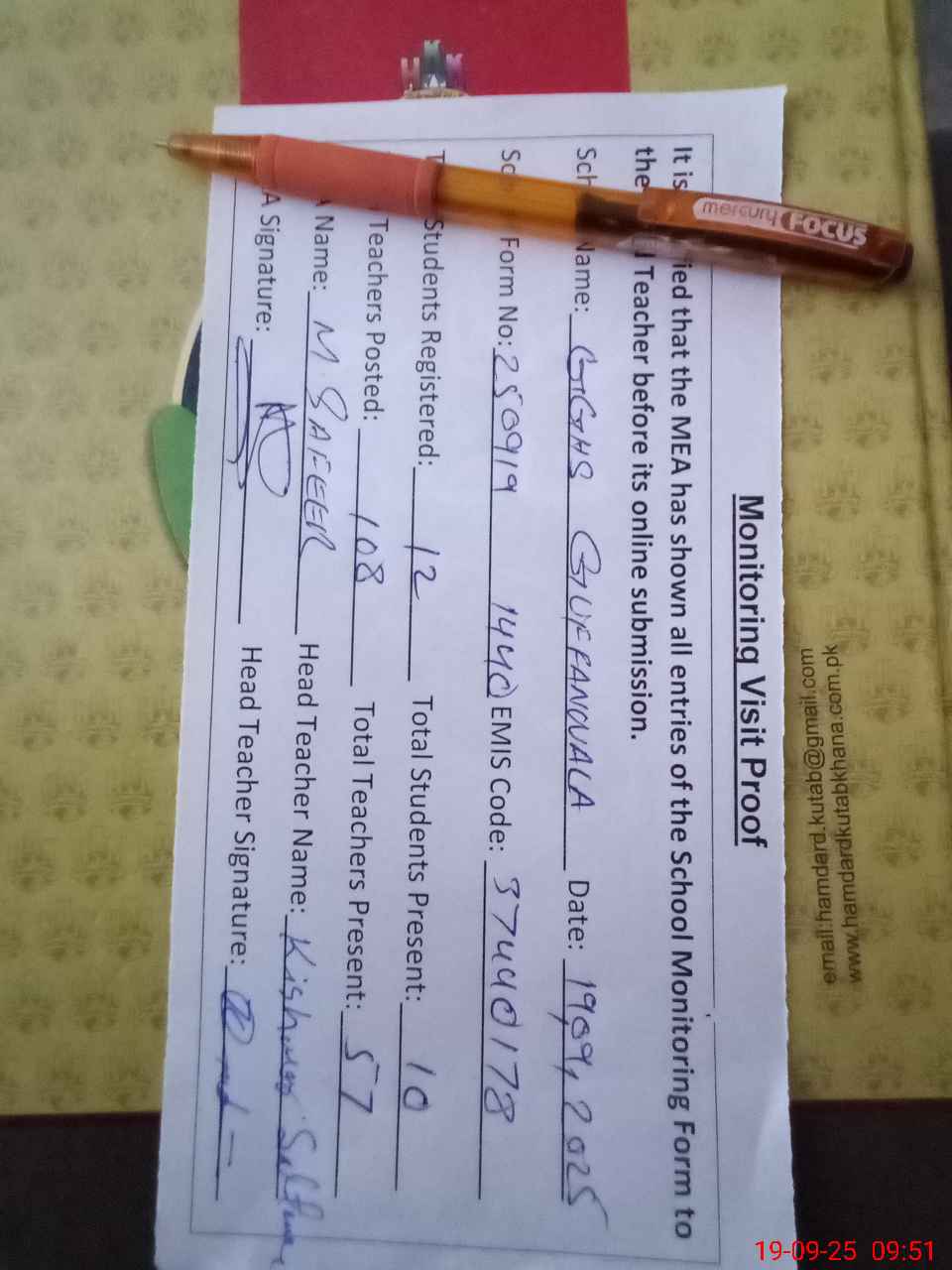 | Attendance Register | Head Teacher | MEA with School | Visit Proof |