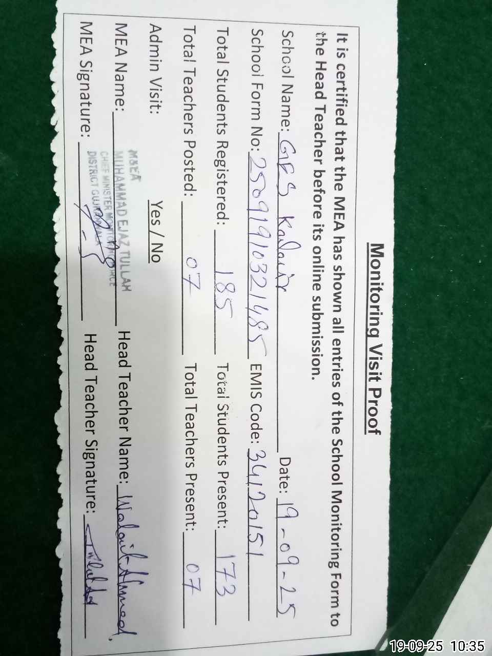 | Attendance Register | Head Teacher | MEA with School | Visit Proof |