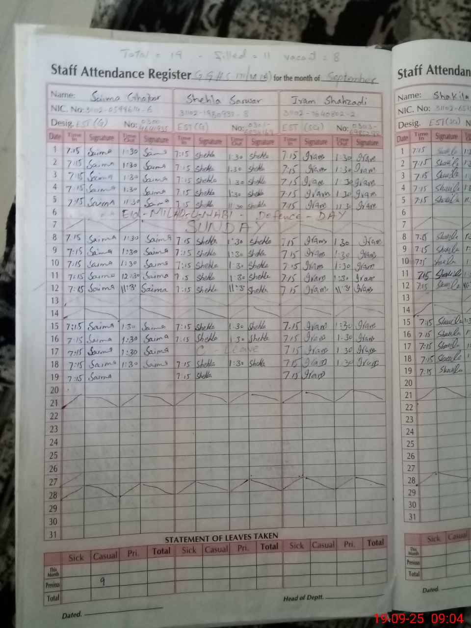 | Leave | Duty | Absent | Maternity | Medical | Ex- Pak |