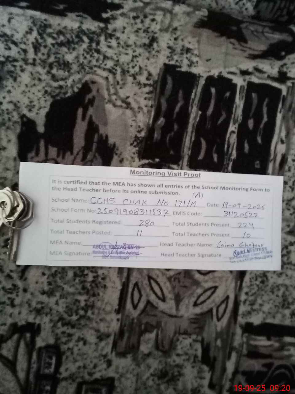 | Attendance Register | Head Teacher | MEA with School | Visit Proof |
